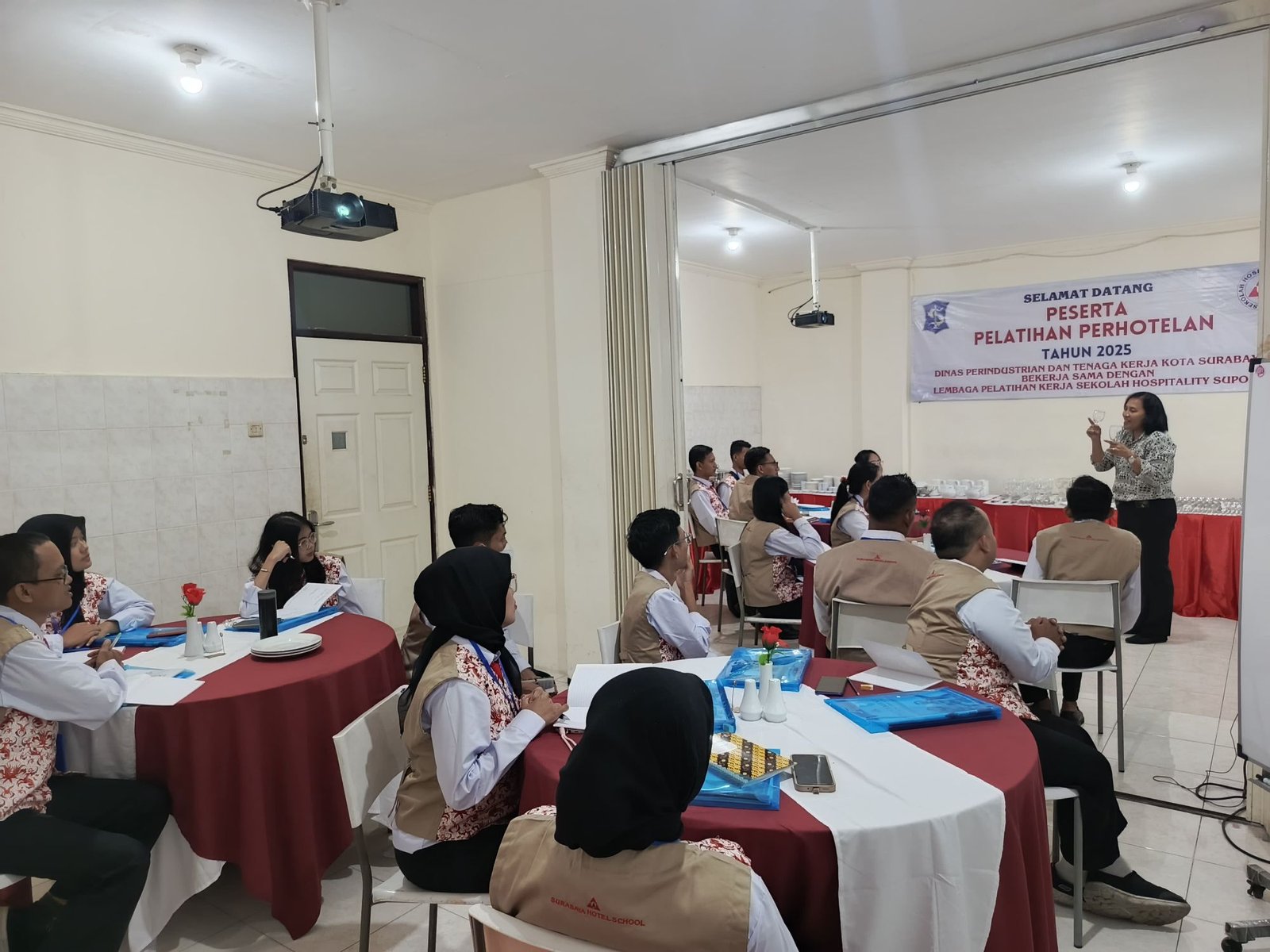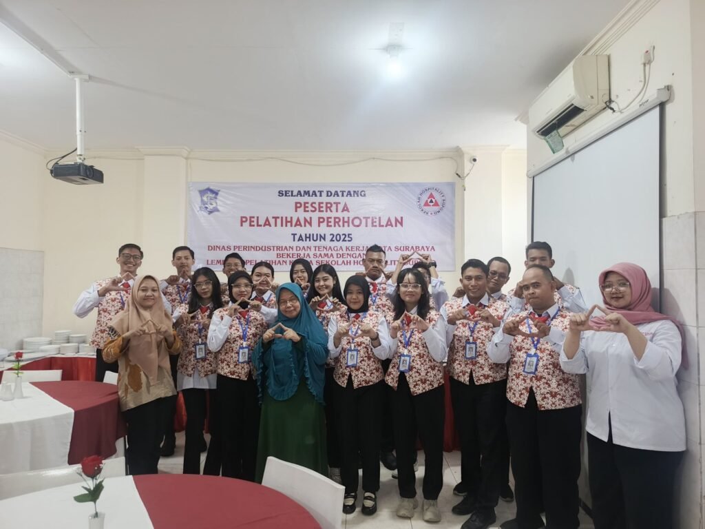 Surabaya – Program Pelatihan Perhotelan Tahun 2025 yang diselenggarakan oleh Dinas Perindustrian dan Tenaga Kerja (Disperinaker) Kota Surabaya bekerja sama dengan Surabaya Hotel School resmi dimulai pada Rabu, 10 September 2025. Antusiasme peserta terlihat sejak awal kegiatan, mengenakan seragam rompi bermotif khas dengan suasana penuh semangat belajar.